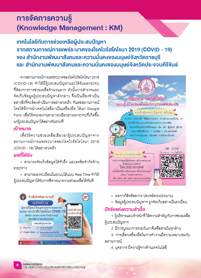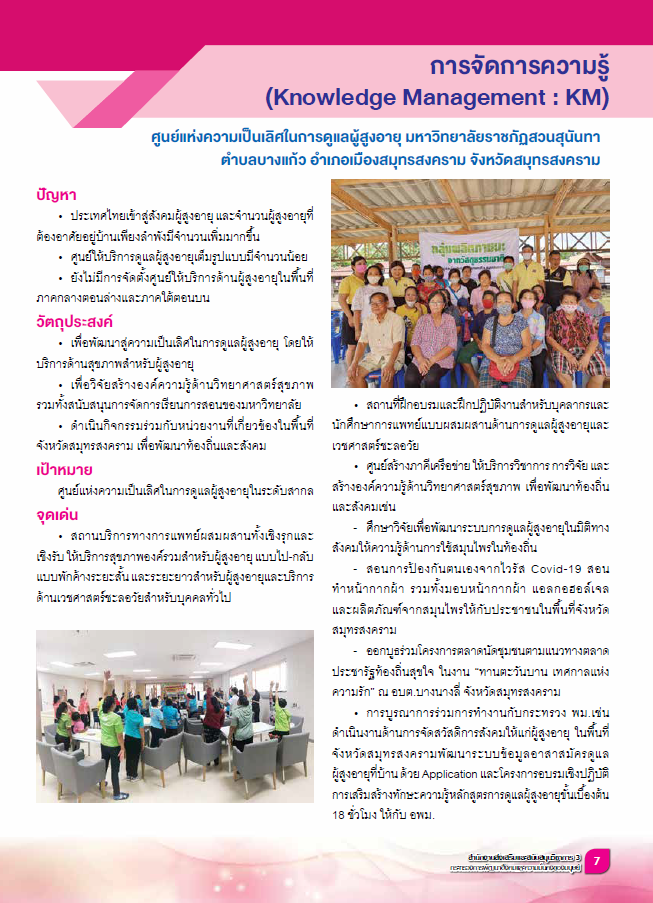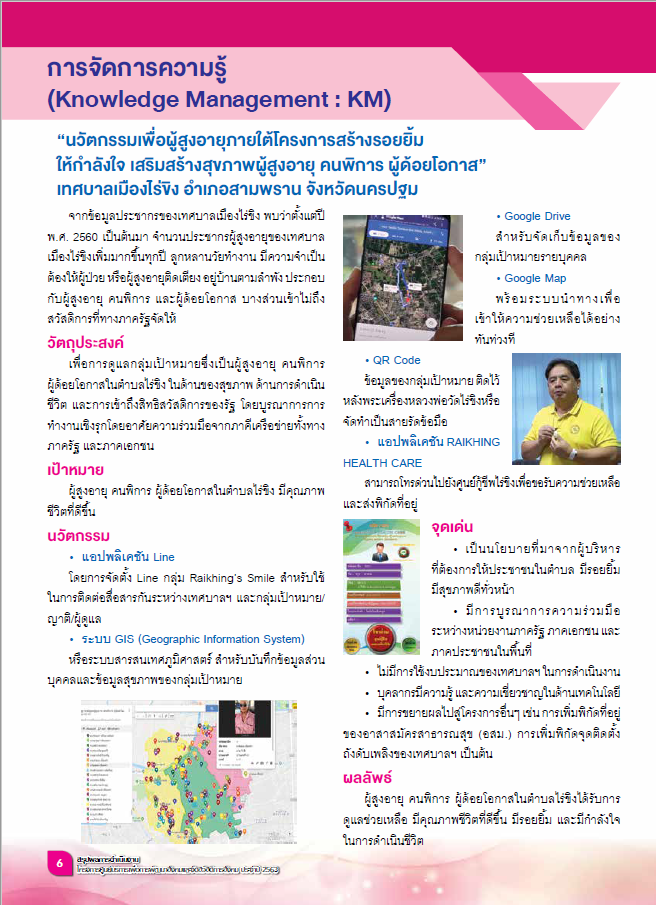 การจัดการความรู้ KM นวัตกรรมเพื่อผู้สูงอายุภายใต้โครงการสร้างรอยยิ้มให้กำลังใจ เสริมสร้างสุขภาพผู้สูงอายุ คนพิการ ผู้ด้อยโอกาส เทศบาลเมืองไร่ขิง อำเภอสามพราน จังหวัดนครปฐม ศูนย์แห่งความเป็นเลิศในการดูแลผู้สูงอายุ มหาวิทยาลัยราชภัฏสวนสุนันทา ตำบลบางแก้ว อำเภอเมืองสมุทรสงคราม จังหวัดสมุทรสงคราม เทคโนโลยีกับการช่วยเหลือผู้ประสบปัญหาจากสถานการณ์การแพร่ระบาดของโรคไวรัสโคโรนา 2019 (COVID-19) ของสำนักงานพัฒนาสังคมและความมั่นคงของมนุษย์จังหวัดราชบุรี และสำนักงานพัฒนาสังคมและความมั่นคงของมนุษย์จังหวัดประจวบคีรีขันธ์